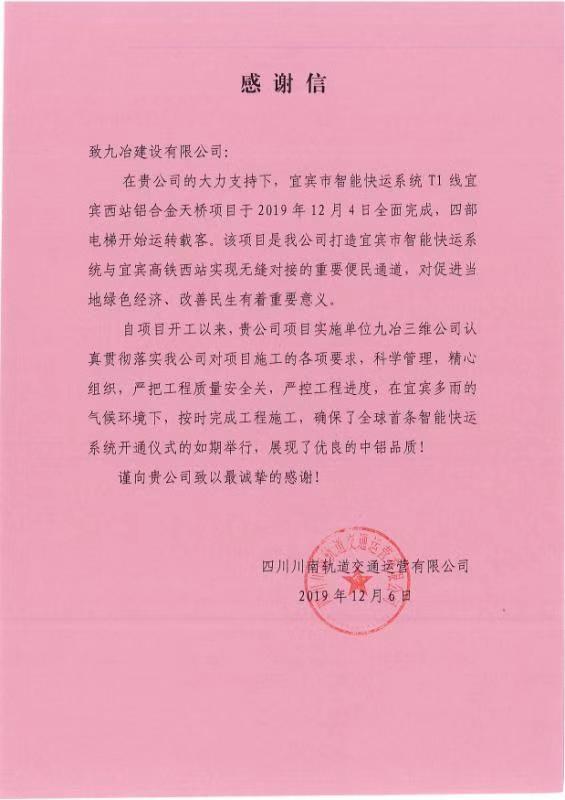 宜賓西站鋁天橋主體結(jié)構(gòu)為“一字形”全裝配中承式鋁合金天橋,設(shè)4部運(yùn)行電梯(兩部自動(dòng)扶梯和兩部垂直觀光電梯);主橋跨徑33米,設(shè)兩個(gè)電梯轉(zhuǎn)換平臺(tái)布置為10.4米+2.2米,設(shè)兩個(gè)人行梯道,是目前國內(nèi)施工難度最大、加工精度要求最高的鋁天橋項(xiàng)目。工程開工以來,三維公司積極發(fā)揚(yáng)九冶“學(xué)習(xí)、創(chuàng)新、敬業(yè)、誠信”的企業(yè)精神,在工期緊、任務(wù)重的情況下,狠抓過程控制,嚴(yán)把質(zhì)量、進(jìn)度關(guān),認(rèn)真履行安全文明施工職責(zé),積極分析工程重點(diǎn)、難點(diǎn),制定保證措施。工地上白天機(jī)械雷鳴,夜晚挑燈夜戰(zhàn),全體項(xiàng)目人員放棄休息,不畏艱難,“5+2”、“白+黑”,爭(zhēng)分奪秒,夜以繼日分班作業(yè),最終順利完工,得到甲方的充分認(rèn)可,在2019年末喜獲感謝信。